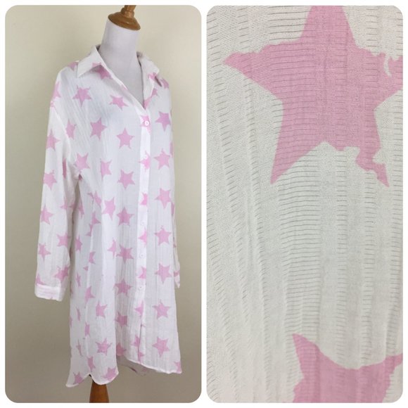 No Brand Dresses Nwot White Pink Stars Print Long Sleeve Semi Sheer Textured Button Shirt Dress Poshmark
